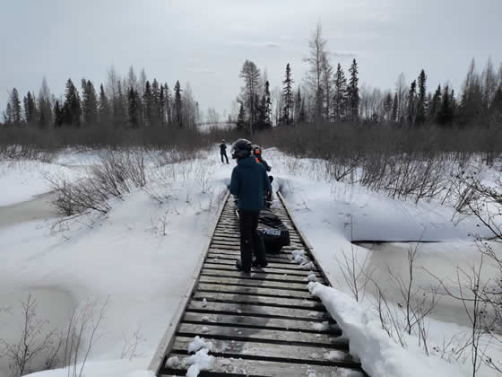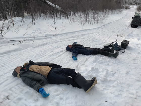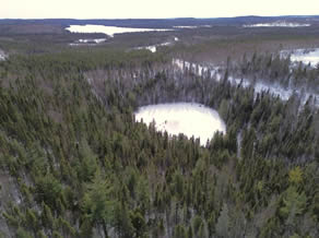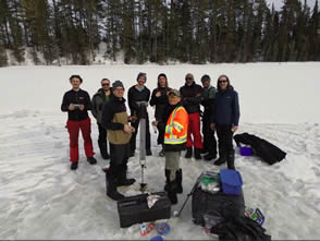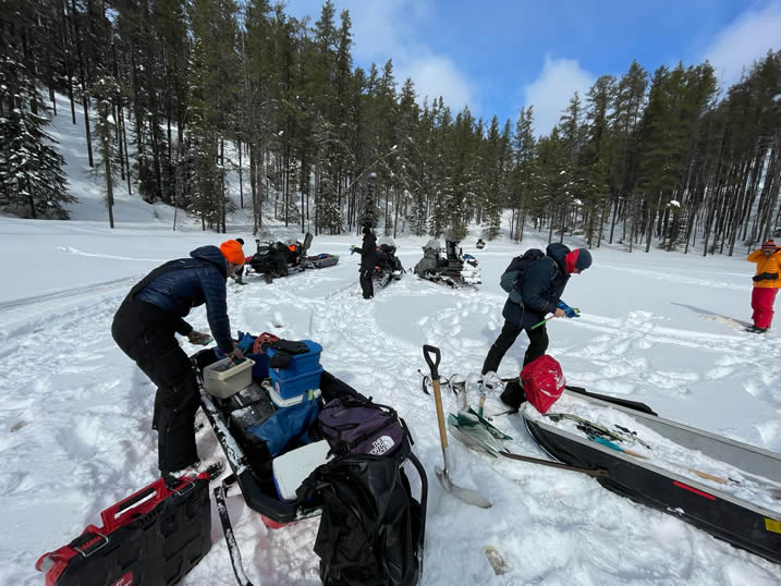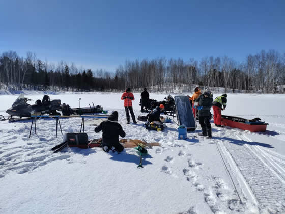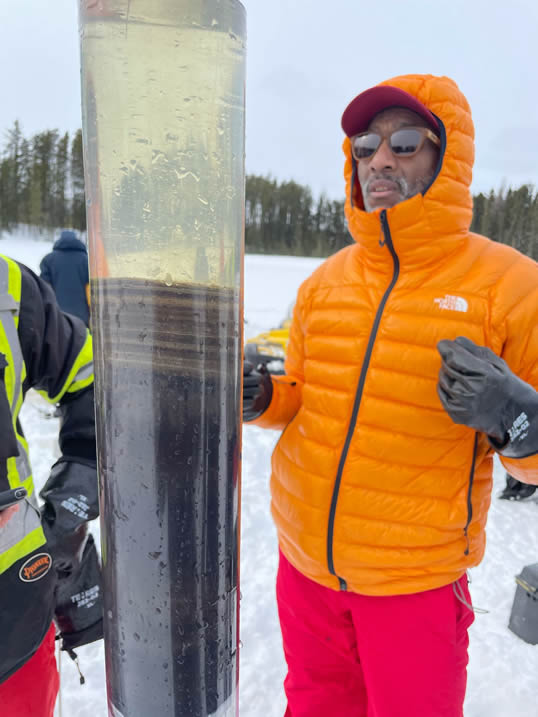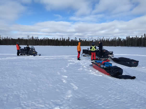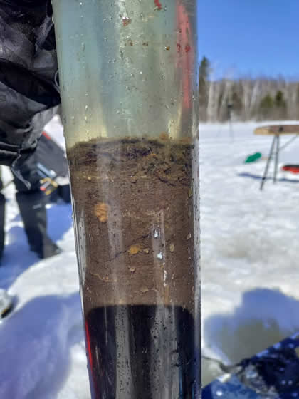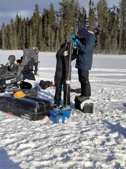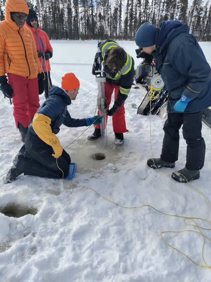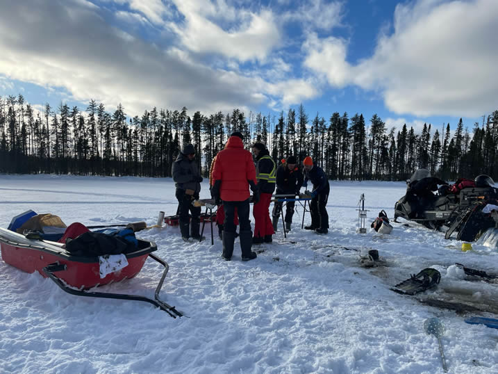 Une campagne de terrain effectuée début mars 2025 a été menée à bien grâce à la collaboration entre les chercheurs de Ressources Naturelles Canada via le Centre de Foresterie des Laurentides, la Communauté des Innus de Pessamit, l’Université du Québec en Abitibi-Témiscamingue, l’Université de Nantes et l’Université de Montpellier. Au total, 7 lacs ont été carottés dans la forêt mixte, dont certains dans des peuplements feuillus, et d’autres dans des peuplements d’épinettes noires et de pins gris. Ces peuplements de conifères boréaux, dissonants par rapport à la matrice mixte, représentent une valeur écologique et économique non négligeable. L’objectif est de comprendre l’origine et la persistance de ces peuplements d’épinettes noires et de pins gris dans la forêt mixte afin d’appréhender leur dynamique future dans le cadre des changements climatiques récents.