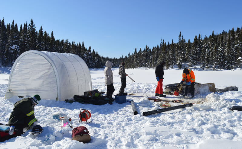 Des étudiants-chercheurs des instituts de recherche sur les mines et environnement (IRME) et sur les forêts (IRF) de l’UQAT ont mené une mission de recherche conjointe au Parc national d’Aiguebelle, les 3 et 4 mars 2022. Ils ont atteint des lacs peu accessibles dans les collines Abijévis pour récolter des sédiments lacustres et mesurer la qualité de l’eau. Le froid extrême ne leur a pas facilité la tâche, le matériel gelant rapidement sous l’effet des températures avoisinant -30°C.