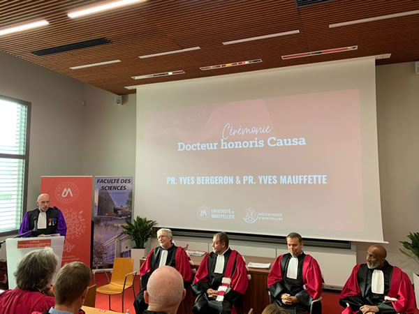 Vendredi 2 décembre 2022, l’Université de Montpellier (UM) a conféré le titre de Docteur honoris causa à Yves Bergeron, professeur en écologie forestière à l’Université du Québec en Abitibi-Témiscamingue (UQAT) et à l’Université du Québec à Montréal (UQAM) et co-directeur du Laboratoire international de recherche sur les forêts froides, ainsi qu’à Yves Mauffette, professeur associé au département des Sciences biologiques à l’UQAM. Ce doctorat honorifique est la plus haute reconnaissance qui est accordée par une université. Cette distinction rend hommage à des personnalités étrangères qui mettent en lumière les valeurs de l’université par leur contribution au monde des idées, de la culture, des arts et des sciences.